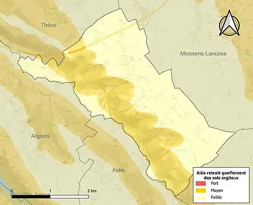 Le retrait-gonflement des sols argileux est susceptible d'engendrer des dommages importants aux bâtiments en cas d’alternance de périodes de sécheresse et de pluie[28]. 39,6 % de la superficie communale est en aléa moyen ou fort (59 % au niveau départemental et 48,5 % au niveau national)[Carte 3]. Depuis le , en application de la loi ELAN, différentes contraintes s'imposent aux vendeurs, maîtres d'ouvrages ou constructeurs de biens situés dans une zone classée en aléa moyen ou fort[Note 4],[29].