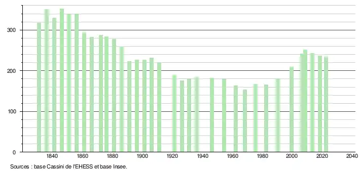 L'évolution du nombre d'habitants est connue à travers les recensements de la population effectués dans la commune depuis 1831. Pour les communes de moins de 10 000 habitants, une enquête de recensement portant sur toute la population est réalisée tous les cinq ans, les populations de référence des années intermédiaires étant quant à elles estimées par interpolation ou extrapolation[34]. Pour la commune, le premier recensement exhaustif entrant dans le cadre du nouveau dispositif a été réalisé en 2008[35].