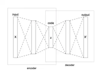 La forme la plus simple d'un auto-encodeur est un réseau de neurones non récurrents qui se propage vers l'avant, très semblable au perceptron multicouches. L'auto-encodeur a une couche d'entrée , une couche de sortie ainsi qu'une ou plusieurs couches cachées les reliant. Toutefois la couche de sortie possède le même nombre de nœuds que la couche d'entrée ; autrement dit et ont le même nombre de dimensions. Le code (aussi appelé variables latentes ou représentation latente) est la couche cachée la plus interne. Elle représente mais dans un espace avec moins de dimensions.