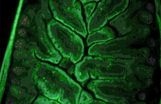 Une image multispectrale de tissu d'un intestin de souris, montrant comment l'autofluorescence peut masquer plusieurs signaux de fluorescence.