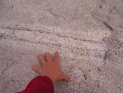 Bandes riches en albite, hornblende et tourmaline provenant de la métasomatisation d'un granite. Stone Mountain (Atlanta, États-Unis).