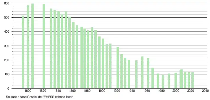 L'évolution du nombre d'habitants est connue à travers les recensements de la population effectués dans la commune depuis 1793. Pour les communes de moins de 10 000 habitants, une enquête de recensement portant sur toute la population est réalisée tous les cinq ans, les populations de référence des années intermédiaires étant quant à elles estimées par interpolation ou extrapolation[18]. Pour la commune, le premier recensement exhaustif entrant dans le cadre du nouveau dispositif a été réalisé en 2007[19].