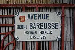 En 1936, l'avenue avait été nommée en l'honneur de Jean Mermoz (1901-1936), aviateur, figure de l'Aéropostale[1]. Cette décision ne fut cependant pas approuvée par le conseil municipal, dirigé par le socialiste Antoine Ellen-Prévot, peut-être pour son engagement politique : proche de François de La Rocque, adhérent des Croix-de-Feu, Jean Mermoz participa à la fondation du Parti social français (PSF) après la dissolution des ligues d'extrême-droite. En 1938, la rue fut donc officiellement nommée en hommage à Henri Barbusse (1873-1935). Écrivain, poète et journaliste au début du XXe siècle, il s'engagea comme soldat pendant la Première Guerre mondiale. Il rencontra le succès pour son livre, le Feu, publié en 1916, description des conditions de vie des soldats et plaidoyer contre la guerre. Durant l'entre-deux-guerres, il fut une figure majeure du pacifisme, mais aussi une personnalité du parti communiste, auquel il adhéra en 1923. Il mourut d'ailleurs à Moscou en 1935[2].