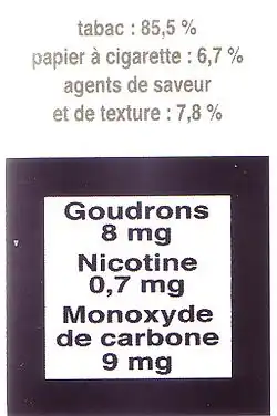- ↑ Arrêté du 25 avril 2002 modifiant l'arrêté du 26 avril 1991 fixant la teneur maximale en goudron des cigarettes et modifiant l'arrêté du 26 avril 1991 fixant les méthodes d'analyse des teneurs en nicotine et en goudron et les méthodes de vérification de l'exactitude des mentions portées sur les conditionnements, ainsi que les modalités d'inscription des messages de caractère sanitaire et des mentions obligatoires sur les unités de conditionnement des produits du tabac