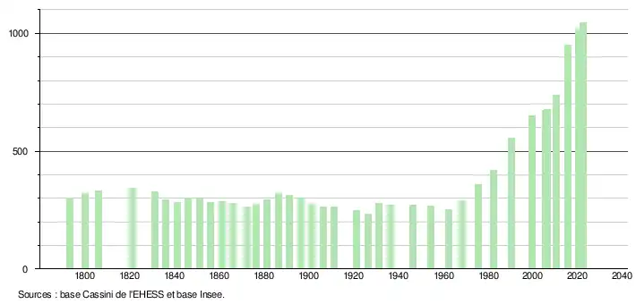L'évolution du nombre d'habitants est connue à travers les recensements de la population effectués dans la commune depuis 1793. Pour les communes de moins de 10 000 habitants, une enquête de recensement portant sur toute la population est réalisée tous les cinq ans, les populations de référence des années intermédiaires étant quant à elles estimées par interpolation ou extrapolation[30]. Pour la commune, le premier recensement exhaustif entrant dans le cadre du nouveau dispositif a été réalisé en 2005[31].