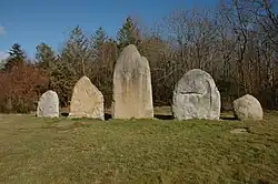 - La commune compte de nombreux sites mégalithiques[33], dont sept sont protégés aux monuments historiques :