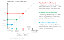 Le bilan énergétique peut être réalisé de deux façons: 1) Bilan de l'énergie fournie/importée et exportée (la phase de surveillance en tant qu'auto-consommation de l'énergie produite sur site peut être incluse); 2) Équilibre entre la demande d'énergie (pondérée) et la production d'énergie (pondérée) (pour la phase de conception, les habitudes de consommation temporelle des utilisateurs finaux - par exemple pour l'éclairage, les appareils ménagers, etc.- font défaut). Alternativement, un solde basé sur des valeurs nettes mensuelles dans lesquelles seuls les résidus par mois sont additionnés à un solde annuel est imaginable. Cela peut être vu soit comme un rapport charge/génération, soit comme un cas particulier de balance import/export où une “autoconsommation mensuelle virtuelle” est utilisé (voir figure 2).