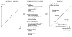 La limite du système de construction est répartie en une limite physique qui détermine quelles ressources renouvelables sont considérées (par exemple dans l'empreinte énergétique des bâtiments, sur site ou même hors site[14]), respectivement combien de bâtiments sont inclus dans le solde (bâtiment unique, ensemble de bâtiments) et une limite d'équilibre qui détermine les utilisations énergétiques incluses (chauffage, refroidissement, ventilation, eau chaude, éclairage, appareils, informatique, services centraux, véhicules électriques et énergie incorporée, etc.). Il convient de noter que les options d'approvisionnement en énergie renouvelable peuvent être priorisées (par exemple par des efforts de transport ou de conversion, disponibilité sur la durée de vie du bâtiment ou potentiel de réplication pour l'avenir, etc.) et donc créer une hiérarchie. On pourrait faire valoir que les ressources à l'intérieur de l'empreinte du bâtiment ou sur le site devraient avoir la priorité sur les options d'approvisionnement hors site.