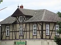 En forme de « L », le bâtiment est constitué d'un sous-sol situé sous la partie sud ouest du bâtiment, d'un rez-de-chaussée, d'un étage et d'un grenier[2]. Ses fondations sont en pierres ; le sous-sol et le rez-de-chaussée sont en briques reliées par du mortier ; l'étage, quant à lui, est conçu selon la technique des colombages en bois avec un remplissage en briques apparentes[2]. Le grenier et le toit sont en bois ; le toit, de structure complexe, est recouvert de tuiles[2].