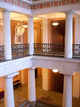 Les espaces les plus importants du bâtiment universitaire sont le hall principal ou vestibule et la salle des fetes. Le symbolisme grec de la façade se poursuit dans le vestibule de trois étages, dont le style imite une ancienne cour. Les colonnes doriques soutiennent les sols et la série de peintures Väinämöinen soitto de style grec de Carl Eneas Sjöstrand illustre l'espace. Au lieu de cela, la salle de bal semi-circulaire, située immédiatement derrière le vestibule, était de style romain et ses colonnes étaient corinthiennes. Cela est dû au fait que le buste d'Alexandre Ier, réalisé par Ivan Martos, qui se trouvait déjà dans la salle de bal de l'Académie de Turku, a été placé à la place d'honneur de la salle, où l'empereur est représenté dans le costume d'un empereur romain. Placer un empereur en costume romain dans une salle grecque aurait été une erreur de style selon le sens du style de l'époque. Carl Ludvig a placé le buste en bronze sur un socle élevé au fond de la salle, où il pouvait être vu jusqu'au bout lorsque les portes de la salle des fêtes et du vestibule étaient ouvertes. Un lutrin récupéré dans la salle des fêtes de l'Académie de Turku et des portes décoratives en acajou, qui se trouvent encore aujourd'hui dans la salle, ont également été placées dans la salle des fêtes.