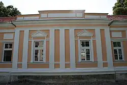 La façade sur rue est caractéristique du style néo-classique, notamment par la décoration plastique autour des fenêtres et par les pilastres qui les séparent. Quatre avancées régulièrement disposées rythment l'ensemble dont deux disposent d'un portail avec un escalier, les deux autres étant dotées de simples fenêtres[réf. nécessaire].