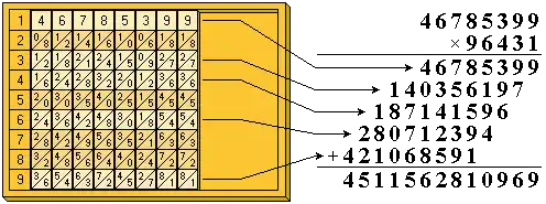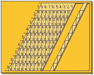 Pour faciliter encore la lecture, les gravures délimitant les cases sont rendues bien visibles, plus que les bords des bâtons. Les produits partiels apparaissent alors très clairement, avec par exemple, sur la figure ci-contre