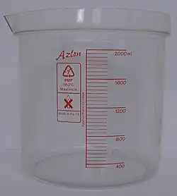 - à partir de 50 mL, ils peuvent comporter une anse permettant une bonne préhension et servir de « mesures ». Certaines mesures avec anse comportent une double graduation en ml et oz.