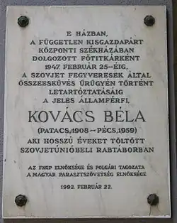 Le Parti communiste hongrois est devenu le plus grand parti lors des élections de 1947 et a servi dans le gouvernement de coalition du Front pour l’indépendance du peuple. Les communistes ont progressivement pris le contrôle du gouvernement et, en 1948, le Parti des petits propriétaires a cessé d’exister en tant qu’organisation indépendante. Le 25 février 1947, les autorités soviétiques arrêtent Kovács pour avoir organisé des « groupes antisoviétiques clandestins » et le déportent en Union soviétique, où il est condamné à 20 ans de prison[1].