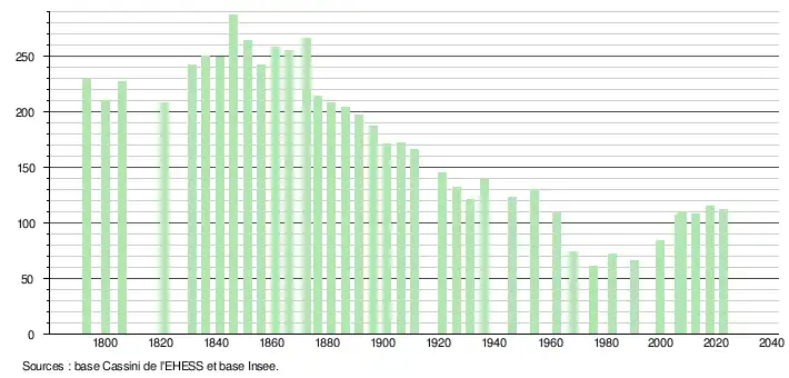 | L'évolution du nombre d'habitants est connue à travers les recensements de la population effectués dans la commune depuis 1793. Pour les communes de moins de 10 000 habitants, une enquête de recensement portant sur toute la population est réalisée tous les cinq ans, les populations de référence des années intermédiaires étant quant à elles estimées par interpolation ou extrapolation[26]. Pour la commune, le premier recensement exhaustif entrant dans le cadre du nouveau dispositif a été réalisé en 2007[27]. En 2022, la commune comptait 112 habitants[Note 4], en évolution de +1,82 % par rapport à 2016 (Haute-Garonne : +8,02 %, France hors Mayotte : +2,11 %). |