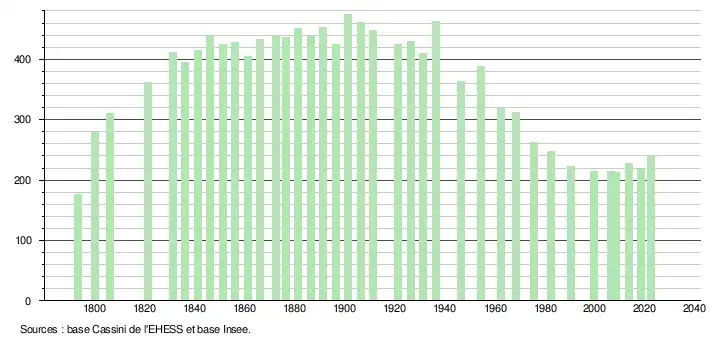 L'évolution du nombre d'habitants est connue à travers les recensements de la population effectués dans la commune depuis 1793. Pour les communes de moins de 10 000 habitants, une enquête de recensement portant sur toute la population est réalisée tous les cinq ans, les populations de référence des années intermédiaires étant quant à elles estimées par interpolation ou extrapolation[36]. Pour la commune, le premier recensement exhaustif entrant dans le cadre du nouveau dispositif a été réalisé en 2008[37].
