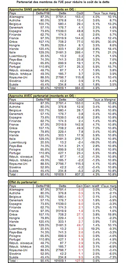 Au sein de l’UE, les mêmes considérations permettent d’affirmer que la somme des coûts des dettes nationales (contractées isolément) excède le coût de la dette totale acquise de manière centralisée par la BCE au nom de ses membres.