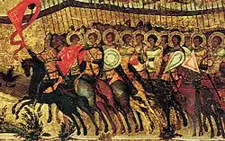 À l'arrière, la troupe les cavaliers qui suivent sont Vladimir Ier avec ses deux fils Boris et Gleb[2]. La figure centrale du groupe des soldats qui est à cheval semble très grande au milieu de son entourage. En fait elle n'est pas plus grande que celle du cavalier qui précède avec sa bannière et que celles des trois qui suivent (Vladimir et ses deux fils). L'illusion d'être plus grand lui vient des vêtements portés et du fait qu'il semble planer au-dessus de la foule qui l'entoure qui est constituée de fantassins de même couleur[19]:17—19.