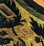 Depuis la ville en feu se déplace une procession aux multiples personnages, à pied ou à cheval, qui se dirigent vers la Jérusalem céleste (ou encore Sion)représentée dans la partie gauche de l'icône. Elle se trouve sur un rocher enfermée dans une mandorle ronde aux couleurs rouges et vertes. Elle n'est ouverte qu'à un seul endroit où mène un chemin, que les soldats vont emprunter pour entrer dans la ville. Cette cité céleste peut être interprétée comme l'image de Moscou[7]. La Vierge Marie tient l'enfant Jésus sur ses genoux. Elle tend des couronnes aux anges qui à leur tour les posent sur les têtes des guerriers[22]. Le jardin de la Jérusalem céleste produit des fruits dans un jardin paradisiaque. Ces fruits sont rouges alors que les arbres hors du jardin ne portent pas de fruits bien qu'ils poussent le long d'une rivière. Ils appartiennent déjà à un paysage terrestre.