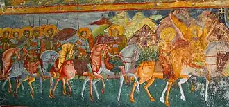 L'une des œuvres la plus proches dans le temps de celle « Bénis soient les guerriers… » est une des fresques de l'église de l'Exaltation-de-la-Sainte-Croix à Pătrăuți (ro) en Roumanie, réalisée à la fin du XVe siècle[7]. L'empereur Constantin y est représenté (son nom est conservé sur la fresque) entouré de quinze soldats et saints auréolés, dont le nom n'a pas été conservé. Ils suivent l'archange Michel qui leur montre une étoile en forme de croix dans le ciel.