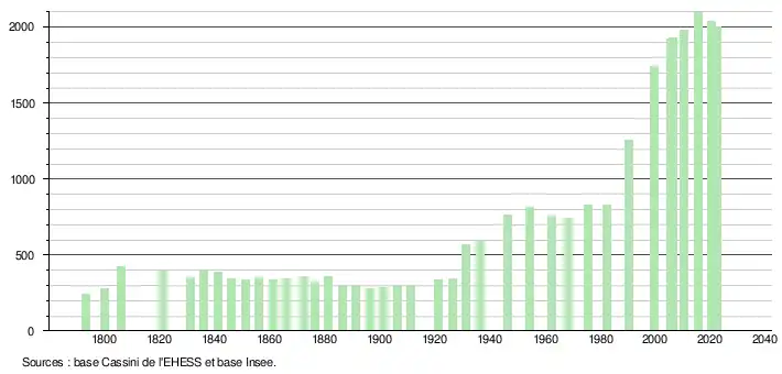 L'évolution du nombre d'habitants est connue à travers les recensements de la population effectués dans la commune depuis 1793. Pour les communes de moins de 10 000 habitants, une enquête de recensement portant sur toute la population est réalisée tous les cinq ans, les populations de référence des années intermédiaires étant quant à elles estimées par interpolation ou extrapolation[40]. Pour la commune, le premier recensement exhaustif entrant dans le cadre du nouveau dispositif a été réalisé en 2005[41].
