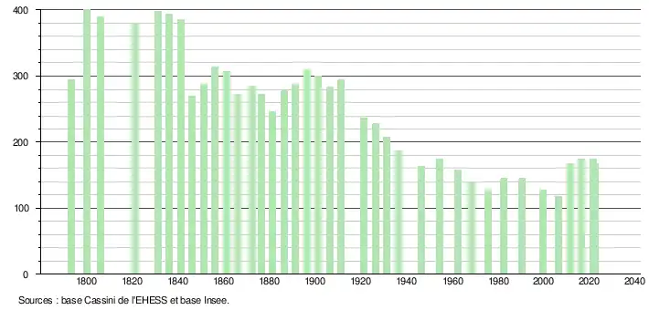 L'évolution du nombre d'habitants est connue à travers les recensements de la population effectués dans la commune depuis 1793. Pour les communes de moins de 10 000 habitants, une enquête de recensement portant sur toute la population est réalisée tous les cinq ans, les populations de référence des années intermédiaires étant quant à elles estimées par interpolation ou extrapolation[20]. Pour la commune, le premier recensement exhaustif entrant dans le cadre du nouveau dispositif a été réalisé en 2006[21].