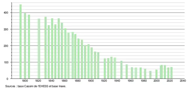 L'évolution du nombre d'habitants est connue à travers les recensements de la population effectués dans la commune depuis 1793. Pour les communes de moins de 10 000 habitants, une enquête de recensement portant sur toute la population est réalisée tous les cinq ans, les populations de référence des années intermédiaires étant quant à elles estimées par interpolation ou extrapolation[15]. Pour la commune, le premier recensement exhaustif entrant dans le cadre du nouveau dispositif a été réalisé en 2007[16].