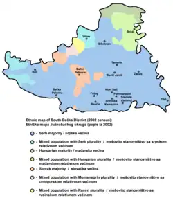 8 municipalités ont une majorité serbe : Novi Sad (75 %), Sremski Karlovci (76 %), Titel (85 %), Žabalj (86 %), Beočin (68 %), Srbobran (67 %), Bačka Palanka (78 %) et Temerin (64 %).