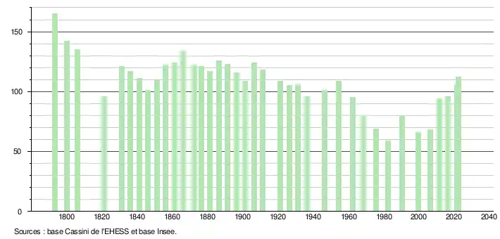 L'évolution du nombre d'habitants est connue à travers les recensements de la population effectués dans la commune depuis 1793. Pour les communes de moins de 10 000 habitants, une enquête de recensement portant sur toute la population est réalisée tous les cinq ans, les populations de référence des années intermédiaires étant quant à elles estimées par interpolation ou extrapolation[40]. Pour la commune, le premier recensement exhaustif entrant dans le cadre du nouveau dispositif a été réalisé en 2006[41].