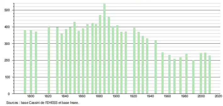 - ↑ Par convention dans Wikipédia, le principe a été retenu de n’afficher dans le tableau des recensements et le graphique, pour les populations légales postérieures à 1999, que les populations correspondant à une enquête exhaustive de recensement pour les communes de moins de 10 000 habitants, et que les populations des années 2006, 2011, 2016, etc. pour les communes de plus de 10 000 habitants, ainsi que la dernière population légale publiée par l’Insee pour l'ensemble des communes.