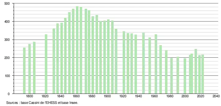 L'évolution du nombre d'habitants est connue à travers les recensements de la population effectués dans la commune depuis 1793. Pour les communes de moins de 10 000 habitants, une enquête de recensement portant sur toute la population est réalisée tous les cinq ans, les populations de référence des années intermédiaires étant quant à elles estimées par interpolation ou extrapolation[30]. Pour la commune, le premier recensement exhaustif entrant dans le cadre du nouveau dispositif a été réalisé en 2008[31].