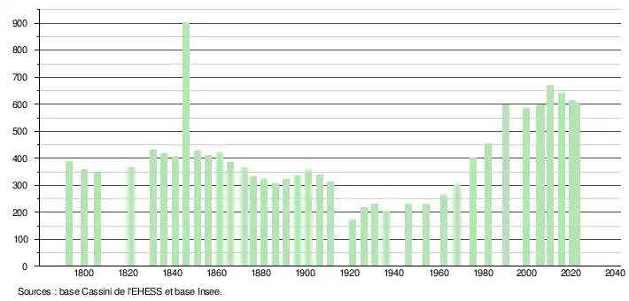 L'évolution du nombre d'habitants est connue à travers les recensements de la population effectués dans la commune depuis 1793. Pour les communes de moins de 10 000 habitants, une enquête de recensement portant sur toute la population est réalisée tous les cinq ans, les populations de référence des années intermédiaires étant quant à elles estimées par interpolation ou extrapolation[32]. Pour la commune, le premier recensement exhaustif entrant dans le cadre du nouveau dispositif a été réalisé en 2005[33].