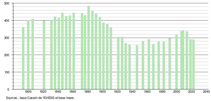 L'évolution du nombre d'habitants est connue à travers les recensements de la population effectués dans la commune depuis 1793. Pour les communes de moins de 10 000 habitants, une enquête de recensement portant sur toute la population est réalisée tous les cinq ans, les populations de référence des années intermédiaires étant quant à elles estimées par interpolation ou extrapolation[21]. Pour la commune, le premier recensement exhaustif entrant dans le cadre du nouveau dispositif a été réalisé en 2008[22].