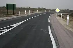 Une balise J1 est implantée sensiblement dans le prolongement de l'axe des voies que peut suivre un conducteur abordant la courbe.