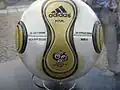 Adidas | Le Teamgeist est un ballon à "seulement" 14 faces. Chaque match de la phase finale a ses propres ballons, avec date du match, stade et équipe imprimés sur les ballons. Pour la finale, des ballons nommés "Teamgeist Berlin" sont de couleur doré. |