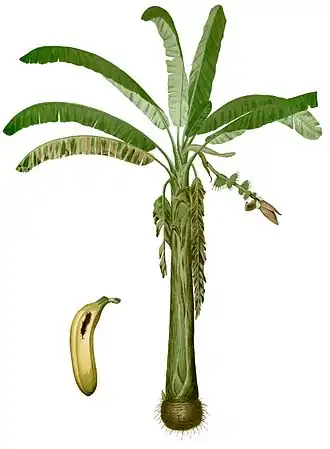 - ↑ Cette tige est formée par l'emboîtement spiralé des pétioles des feuilles qui naissent directement du rhizome.