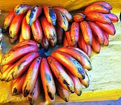 - Banane à cuire : dans ce groupe, les principales sont les bananes plantains. Ce sont des bananes plus grosses que les bananes desserts. Bien que tout aussi savoureuses crues que les premières, leur chair est plus ferme (pulpe constituée d'amidon moins hydrolysé en sucres solubles que celle des bananes dessert) et il est plutôt d'usage de les consommer après cuisson car elles restent entières[23]. Elles sont préférées un peu vertes pour cet usage et leur texture est alors assez proche des tubercules farineux. Leur commerce international est peu important. La peau des fruits est généralement vert-jaune ou mauve et la chair est composée d'une forte proportion d'amidon non hydrolysé et contient moins de sucre que les bananes dessert. Plusieurs centaines de variétés existent toutes cultivée localement[24]. Le génome donnant le caractère farineux des fruits est issu de M. a. banskii, errans ou microcarpa.