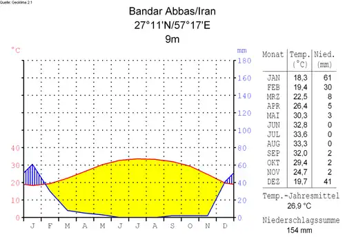 Le climat de Bandar Abbas et de sa région est chaud et humide. La température oscille en hiver entre 25 °C et 28 °C et peut monter jusqu'à 49 °C en été. La moyenne des précipitations annuelles est de 251 mm pour un taux d'humidité de 66 %.