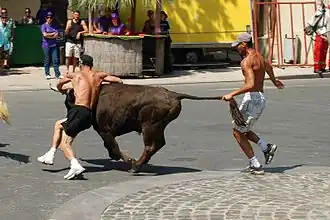 Les attrapaïres (« attrapeurs », figurant les jeunes villageois d'antan) tentent ici de capturer les taureaux par derrière en les saisissant par la queue et les cornes. Il existe des concours d'attrapaïres où un prix récompense celui qui attrape le plus de taureaux.