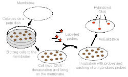 Afin d'isoler des clones qui contiennent des régions d'intérêt d'une banque, celle-ci doit d'abord être filtrée. Une méthode de criblage est l'hybridation, dans laquelle chaque cellule hôte transformée d'une banque ne contiendra qu'un seul vecteur avec un insert d'ADN. Toute la banque peut être plaquée sur un filtre sur support. Le filtre et les colonies sont préparés pour l'hybridation puis marqués avec une sonde[13]. L'ADN-cible (l'insert d'intérêt) peut être identifié par détection, par exemple en autoradiographie, en raison de l'hybridation avec la sonde comme indiqué ci-dessous.