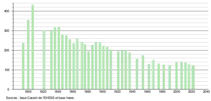 L'évolution du nombre d'habitants est connue à travers les recensements de la population effectués dans la commune depuis 1793. Pour les communes de moins de 10 000 habitants, une enquête de recensement portant sur toute la population est réalisée tous les cinq ans, les populations de référence des années intermédiaires étant quant à elles estimées par interpolation ou extrapolation[25]. Pour la commune, le premier recensement exhaustif entrant dans le cadre du nouveau dispositif a été réalisé en 2006[26].