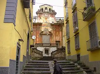 De nombreux édifices religieux sont précédés d'un escalier-parvis, une solution due aux aspects symboliques et techniques. Du point de vue symbolique, il représente la séparation entre le monde extérieur laïque et profane avec le monde spirituel et sacré de l'église et du couvent. L'aspect technique fait de l'escalier l'élément avec lequel il est possible de gravir la pente naturelle du sol de la ville. En fait, en raison de la morphologie escarpée de Naples, les églises ont été construites sur de vrais travaux de terrassement, et reliées au niveau inférieur par l'intermédiaire d'une série d'escaliers. En même temps, les escaliers peuvent servir à donner davantage d'élan à la structure, en soulignant aussi bien la valeur architecturale que la symbolique.