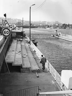 Les portes Nord de l'écluse étant restées en position presque fermées, le plancher de bois qui permettait autrefois de traverser l'écluse en passant sur les portes fut noyé par le rehaussement du niveau de l'eau et a disparu. Les portes centrales et Sud sont restées en position ouverte. De ce fait une passerelle piétonne accessible par un petit escalier fut installée au niveau des portes Nord, permettant ainsi de traverser les 16 mètres de largeur de l'écluse et d'accéder au bajoyer Est.