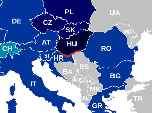 - ↑ Entre les environs de Mohács et de Donji Miholjac, ou de Somogyudvarhely et de Gotalovo (hu) respectivement ; AFP, « Migrants: la clôture à la frontière croato-hongroise achevée », Libération, (lire en ligne).