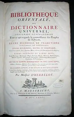 - ↑ Le titre complet de l'édition de 1777-1779 est : Bibliothèque orientale, ou Dictionnaire universel contenant tout ce qui fait connoître les peuples de l'Orient. Leurs histoires et traditions, tant fabuleuses que véritables, leurs religions et leurs sectes, leurs gouvernemens, politique, loix, mœurs, coutumes et les révolutions de leurs empires, les arts et les sciences, la théologie, médecine, mythologie, magie, physique, morale, mathématiques, histoire naturelle, chronologie, géographie, observations astronomiques, grammaire et rhétorique, les vies de leurs saints, philosophes, docteurs, poëtes, historiens, capitaines, et de tous ceux qui se sont rendus illustres par leur vertu, leur sçavoir ou leurs actions ; des jugemens critiques et des extraits de leurs livres écrits en arabe, persan ou turc, sur toutes sortes de matières et de professions, par Mr d'Herbelot. La Bibliothèque fut rééditée à Maestricht (1776), à la Haye (4 volumes, 1777-1799), puis à Paris (6 volumes, 1781-1783). La dernière édition est enrichie des contributions de l'orientaliste néerlandais Albert Schultens et de l'orientaliste allemand Johann Jacob Reiske, ainsi que d'un supplément fourni par Claude de Visdelou et Antoine Galland. Texte en ligne