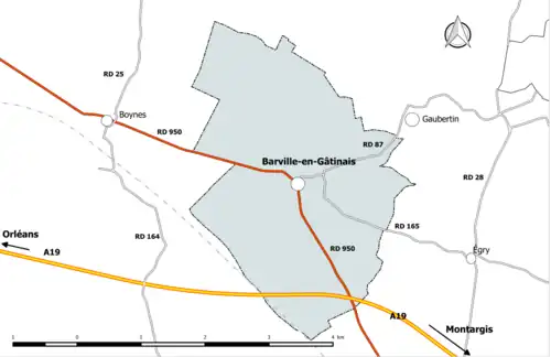 La commune est traversée par la route départementale 950, une route à grande circulation[31] supportant en 2014 un trafic de 3 457 véhicules/jour dont 387 poids lourds (11 %)[32] qui relie Dadonville à Ladon ainsi que deux routes départementales à faible trafic : la RD 165 (371 véhicules/jour), qui relie Barville-en-Gâtinais à Bordeaux-en-Gâtinais, et la RD 87 (559 véhicules/jour), qui relie Barville-en-Gâtinais à Gaubertin[32].