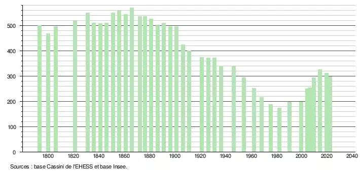 - ↑ Fiches Insee - Populations de référence de la commune pour les années 2006, 2007, 2008, 2009, 2010, 2011, 2012, 2013, 2014, 2015, 2016, 2017, 2018, 2019, 2020, 2021 et 2022.