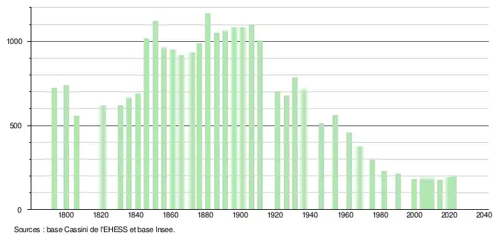 | L'évolution du nombre d'habitants est connue à travers les recensements de la population effectués dans la commune depuis 1793. Pour les communes de moins de 10 000 habitants, une enquête de recensement portant sur toute la population est réalisée tous les cinq ans, les populations de référence des années intermédiaires étant quant à elles estimées par interpolation ou extrapolation[21]. Pour la commune, le premier recensement exhaustif entrant dans le cadre du nouveau dispositif a été réalisé en 2004[22]. En 2022, la commune comptait 199 habitants[Note 1], en évolution de +9,94 % par rapport à 2016 (Corrèze : −0,59 %, France hors Mayotte : +2,11 %). |
