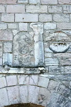 À l'entrée du bâtiment d'accueil qui abrite la boutique de la basilique, a été remontée la porte du fort, surmontée de l'écusson très abîmé de François Ier, c'est-à-dire les armes de France aux trois fleurs de lys avec au-dessous la salamandre[15]. Du côté droit de l'écusson, se trouve un rond de pierre rongé par le temps où l'on aperçoit quelques vestiges d'une sculpture qui représentait l'agneau de saint Jean avec la banderole[16].