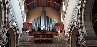 L'orgue de tribune inauguré en 1901 était l'œuvre de Joseph Gutschenritter, directeur de la manufacture Joseph Merklin. La Grande Guerre ayant anéanti la basilique, les orgues furent totalement détruites. Elles furent remplacées, en 1958, par un instrument construit par la maison Jacquot-Lavergne, avec réemploi de la tuyauterie de l'ancien orgue de chœur[8]. L'orgue est composé de 1 944 tuyaux en hêtre ou en alliage d'étain et de plomb.